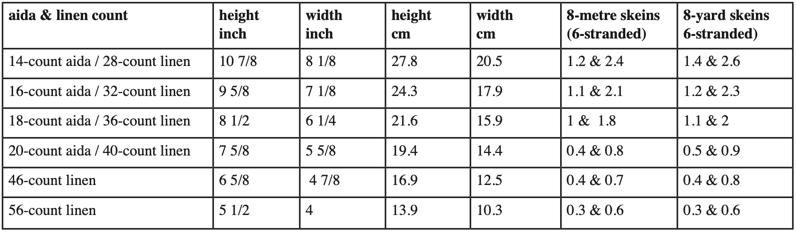 The graph below gives size- and floss estimates for a wide range of materials. Floss calculations are based on working with 2 strands on 28- to 36-count linen (14- to 16-count aida). Higher counts use a single strand. You are free to stitch with as many strands as you like. The first floss estimate is for black, the 2nd for red. For instance, on 32-count linen, you would require 1.1 skein of black floss (standard 8 metre length skeins such as DMC and Anchor), and 2.1 skein of red floss.