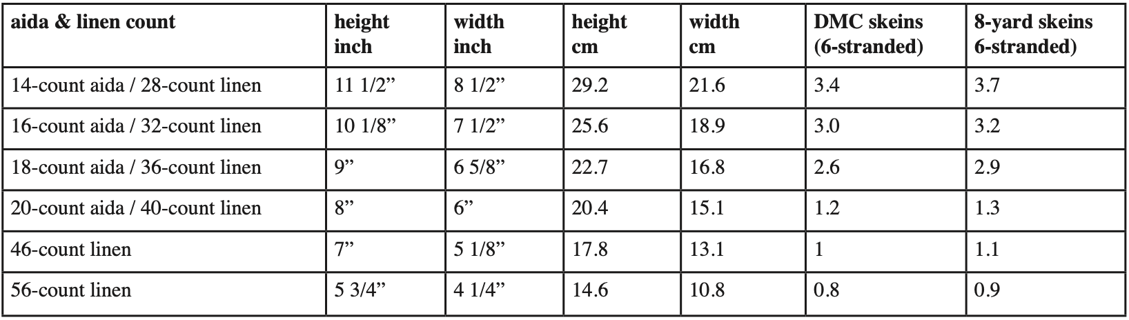 This design has a total of 6036 crosses. Please see the chart below for size and floss estimates when worked on a variety of materials. Floss calculations are based on working with 2 strands of 6-stranded floss on 14 through 18 count Aida (28-36 count linen). Higher counts require only one strand. You are of course free to stitch with any amount you see fit.
