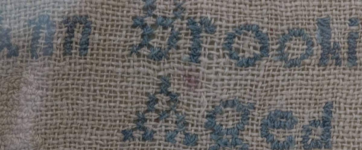 As you can see in the third photo, Ann signed her work using capital letters stitched over two threads, but the lower alphabet is all stitched in more detail over 1 thread. This should be simple enough to chart, and I will keep it as it is. On either side of “Aged 12 Years” you might notice what I think are either dogs or (English) lions. This will prove to be a tricky one to count as it’s one over one, in the same colour as the linen!