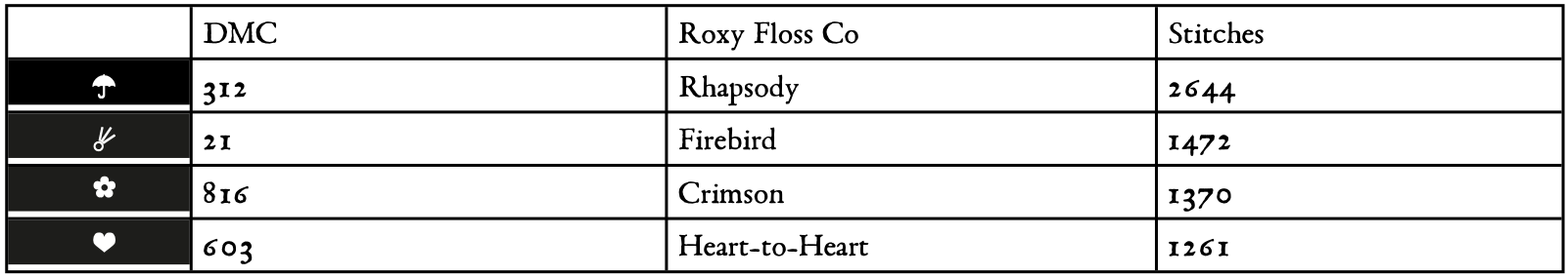 This design measures 107 crosses wide and 143 crosses high. It features only full crosses and has no specialty stitches. From the second page of the pattern onwards, you will notice a greyed-out area of 3 crosses wide — this indicates overlap with the previous page to make it easier for you to continue stitching. Please see the colour key on the previous page for each symbol, the name of the floss (both Roxy Floss Co and DMC alternatives), and the number of stitches per colour.