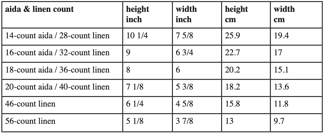 The graph below gives size estimates for a wide range of materials. You will need one skein of each colour on all counts of linen and aida, with the exception of “Rhapsody”. On 28 through to 36-count linen (14 through to 18-count aida), I recommend two floss skeins.