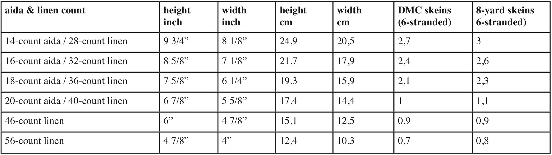 This design is 113 crosses wide and 137 crosses high and has a total of 4903 crosses. The graph below gives size estimates for a wide range of material as well as an estimation to the floss required. Please refer to the amount of floss required in the graph below.  Floss calculations are based on working with two strands on 28- to 36-count linen (14- to 16-count aida). Higher counts use a single strand. You are free to stitch with as many strands as you like.