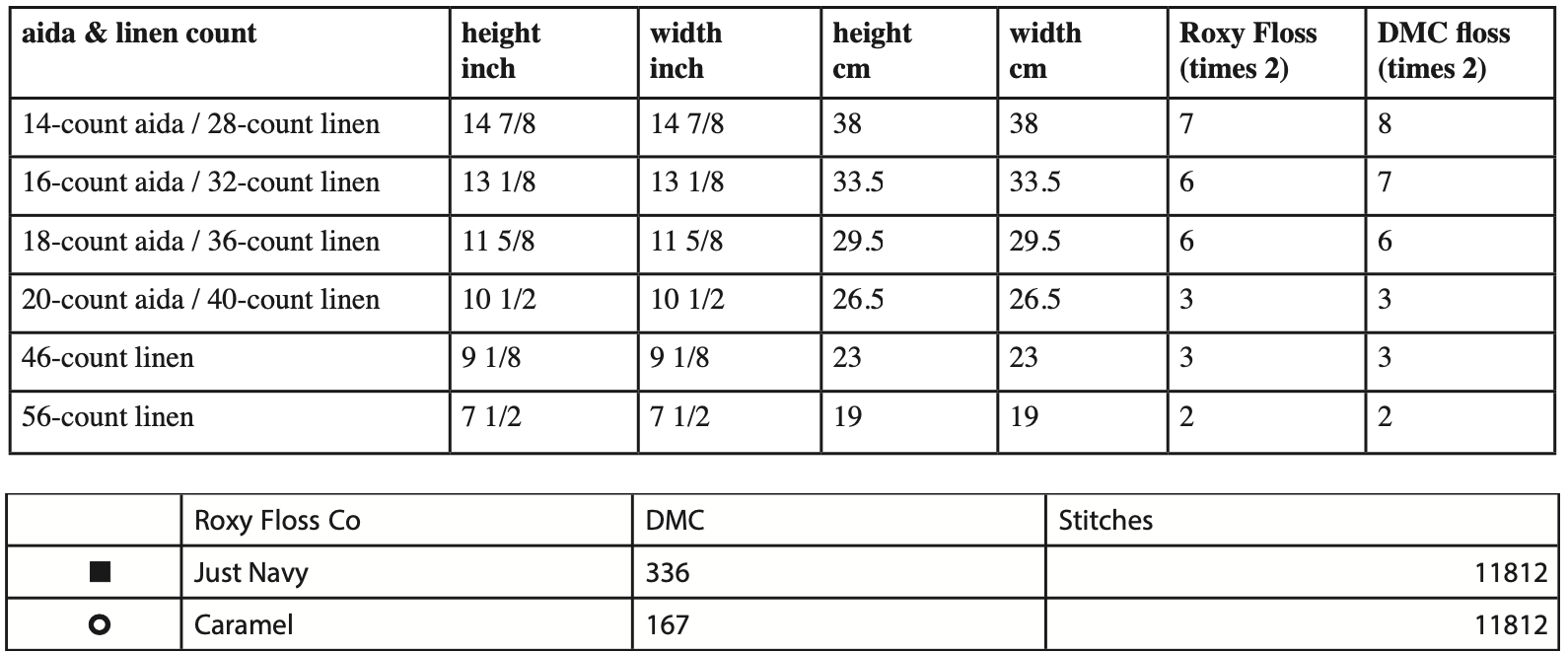 This design measures 209 crosses in width and height. Please see the table below for size and floss estimates. Each aida and linen count has estimates for the required floss for one colour. As both colours have the same number of crosses (11812), you will need to buy the minimum suggested amount for each colour.