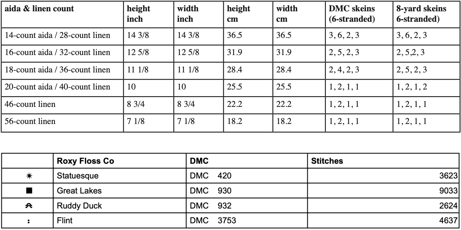 The key below gives both Roxy Floss Co. colours (available through www.evertote.ca) and DMC alternatives, as well as the amounts required. The last two columns have four numbers linked to the symbol key. For instance, when working on 28-count linen, you will need 3 skeins of Statuesque, 6 of Great Lakes, 2 of Ruddy Duck, and 3 of Flint.