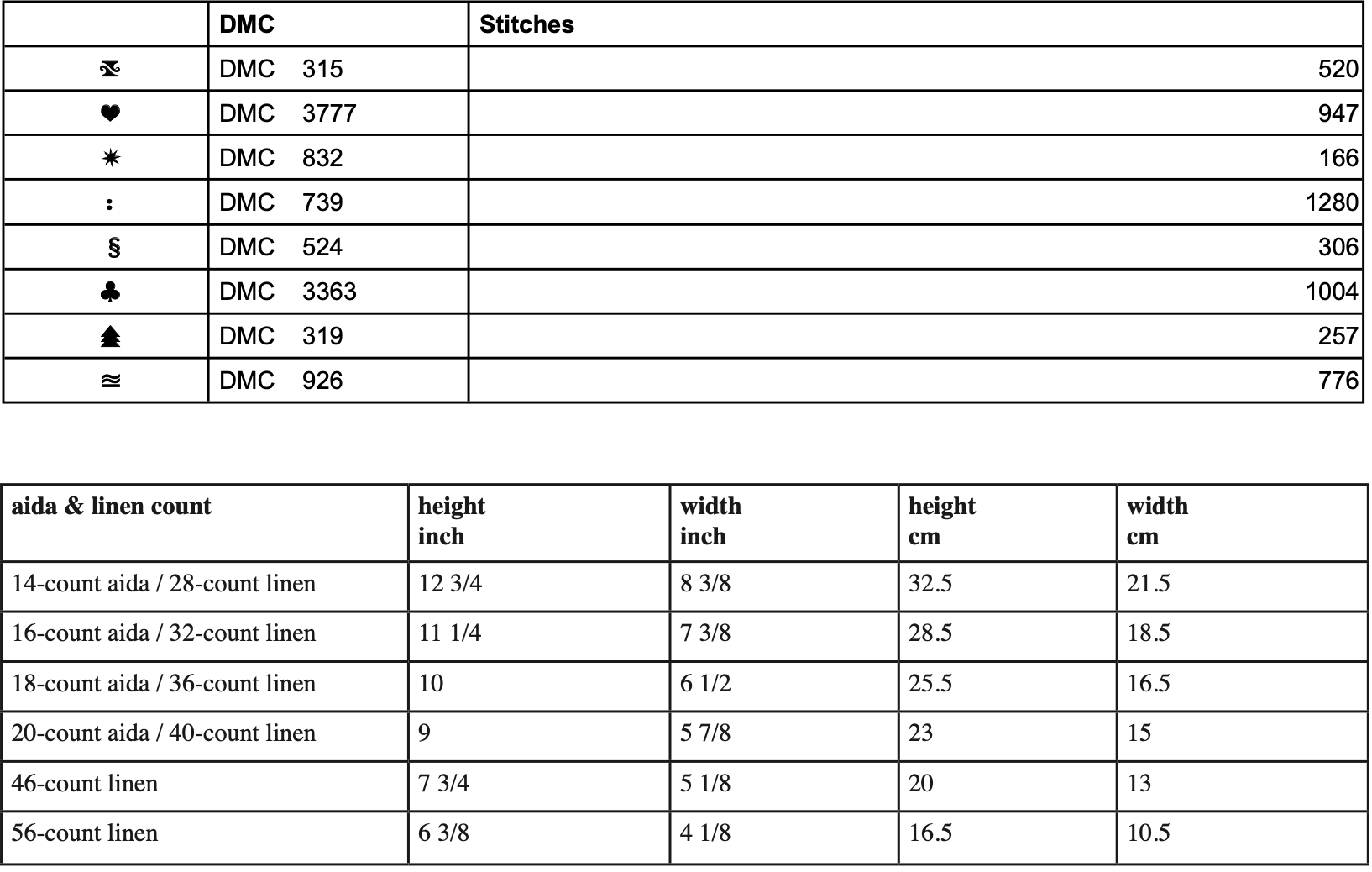 This design measures 117 crosses in width and 179 in height. Please see the chart on the following page for size estimates. Each colour uses less than one skein of floss, whether you work with 1 or 2 pulled strands.