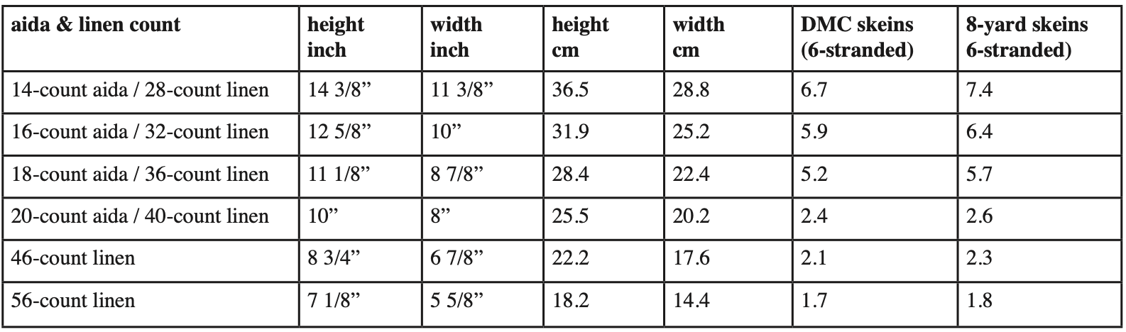 It has 10353 crosses and 2216 backstitches. Please see the graph on the next page for size and floss estimates. Floss estimates are based on working with two pulled strands (14 – 18-count Aida or 28 – 36-count linen) or one strand (20-count Aida / 40-count linen and higher). It is, of course, up to you how many strands you want to use for your project. A three-cross greyed-out overlap area is found from the 2nd pattern page onwards to help you find your way.