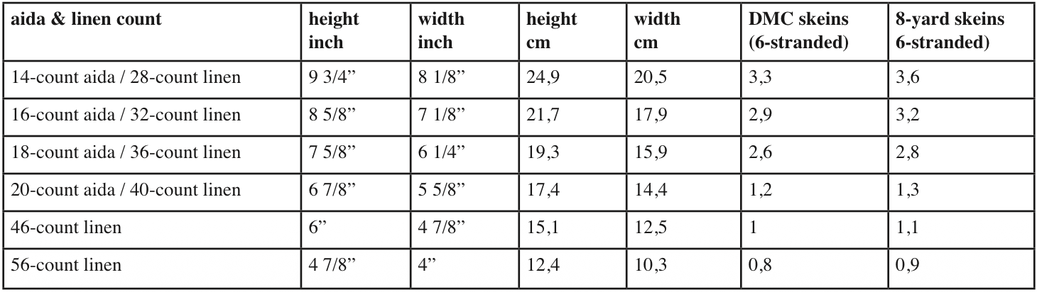 Floss calculations are based on working with two strands on 28- to 36-count linen (14- to 16-count aida). Higher counts use a single strand. You are free to stitch with as many strands as you like.