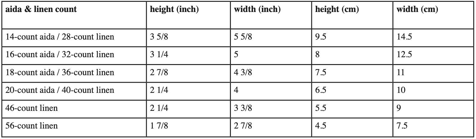 This design is 51 crosses wide, and 79 crosses high. It has a total of 2388 crosses. It features only full crosses, and is suitable to be worked on any countable material. As this is a monochrome design, you can choose any colour (or colours) of your liking. When working with 2 pulled strands from a 6-strand skein, you require two skeins when working on 28, 32, and 36-count linens. When working with one strand, one skein should be enough on all counts of linen. Below you find a table with the size of your finished piece when working on various counts of fabric. Note that these are estimates only, finished sizes may vary depending on the weave of your fabric.