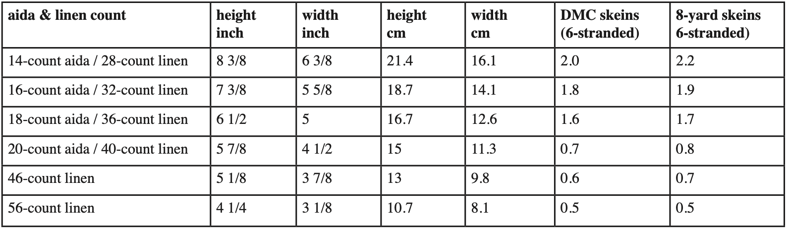 This design measures 89 crosses in width and 118 in height and has 3570 crosses. Please see the graph below for size- and floss estimates. Floss estimates are based on working with two pulled strands (14 – 18-count Aida or 28 – 36-count linen) or one strand (20-count Aida / 40-count linen and higher). It is, of course, up to you how many strands you want to use for your project. A three-cross greyed-out overlap area is found on the 2nd pattern page to help you find your way.