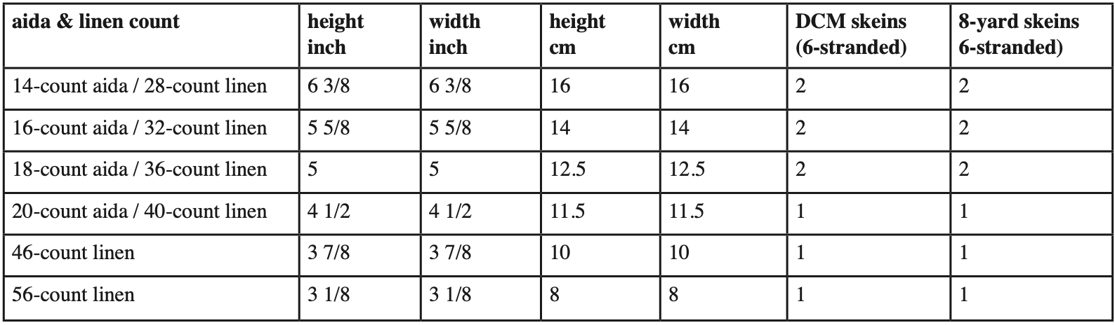 This design is 89 crosses wide and high. It has a total of 3034 crosses. It features only full crosses and is suitable to be worked on any countable material. As this is a monochrome design, you can choose any colour (or colours) of your liking. Please refer to the table below for size estimates of your finished piece on various sizes of linen and aida. It also gives an estimate of the amount of hanks of floss required to complete your project. Calculations are based on working with two pulled strands on 14, 16, and 18-count aida (28, 32, and 36-count linen). Higher counts require only one pulled strand of six-stranded floss.