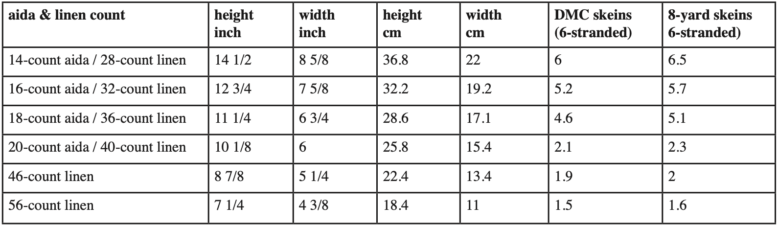 This design measures 121 crosses in width and 203 in height and has 10653 crosses. Please see the chart below for size- and floss estimates. Floss estimates are based on working with two pulled strands (14 – 18-count aida or 28 – 36-count linen) or 1 strand (20-count aida / 40-count linen and higher). It is, of course, up to you how many strands you want to use for your project.