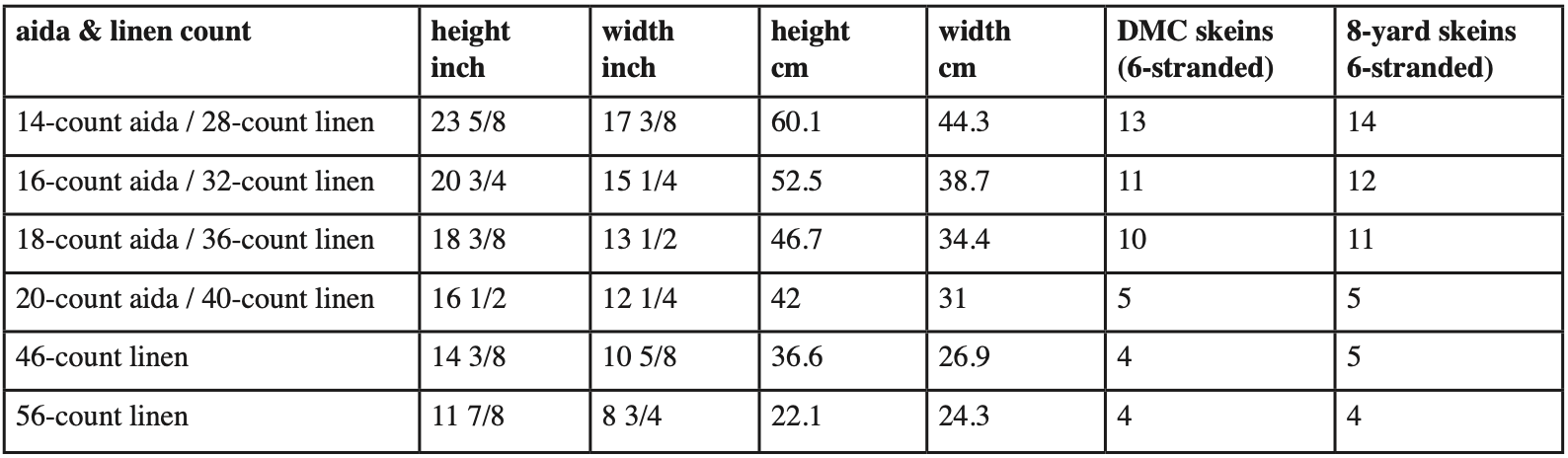 This design measures 244 crosses in width and 331 crosses in height and has 21621 crosses. Please see the chart below for size- and floss estimates. Floss estimates are based on working with two pulled strands (14 -18-count aida or 28 – 36-count linen) or 1 strand (20-count aida / 40-count linen and higher). It is, of course, up to you how many strands you want to use for your project. Don’t feel limited to stitching the design entirely monochrome – use as many or as little colour as you wish. You can utilise the bonus alphabet chart to further personalise your design.