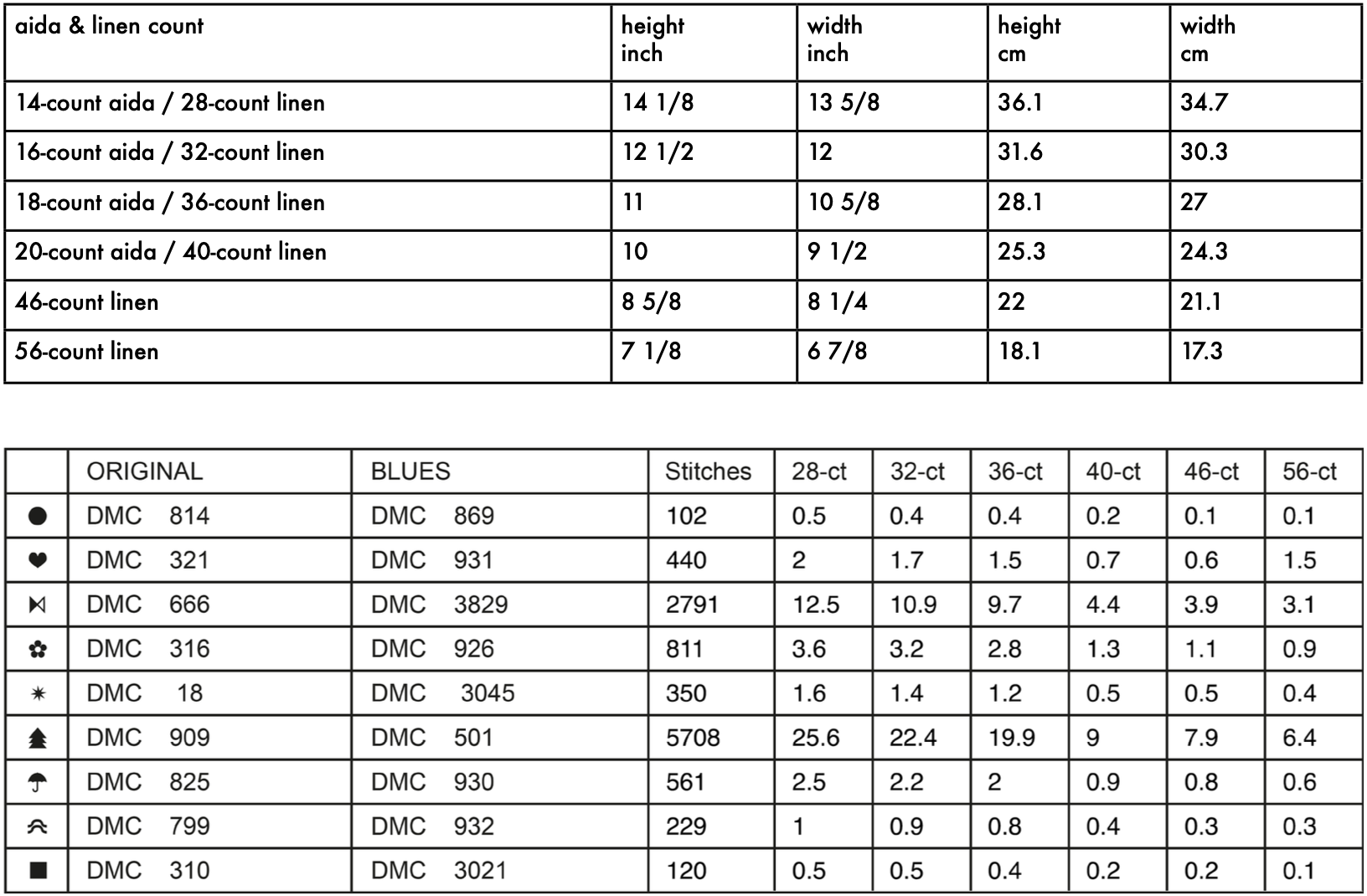 Janet’s sampler measures 191 crosses in width and 199 crosses in height. Please see the graph below for sizing estimates. The design has a total of 9 colours. The key gives the original shades found on the back of the sampler and my alternative colour choice with shades of blue. The “stitches” column indicates how many stitches each colour has, followed by columns indicating the amount of metres of floss required. These amounts are based on working with 6-stranded floss, working with two pulled strands on 28, 32 and 36-count linen, and 1 pulled strand on higher counts. A typical DMC skein has 8 metres of floss – most hand-dyed floss brands have 8-yards