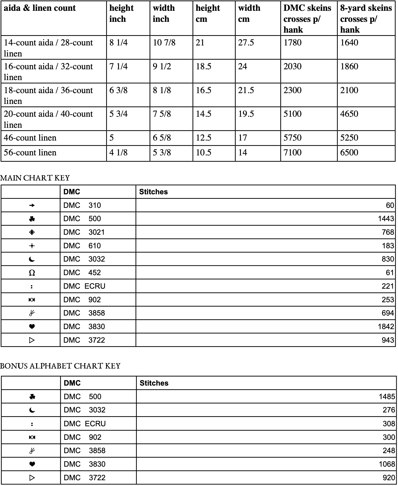 The sampler and the alphabet chart measure 152 crosses in width and 115 in height. Please see the graph below for sizing estimates. The design has a total of 11 colours. The symbol keys on the following page give the total crosses of each colour for each chart.