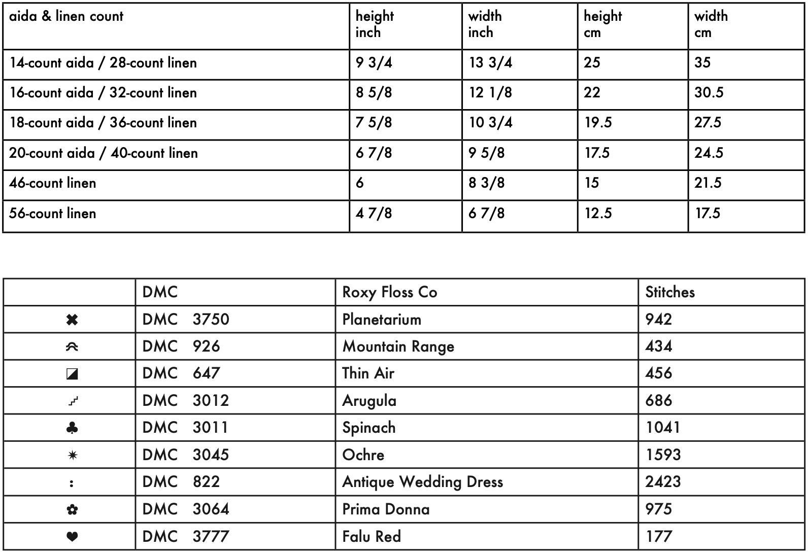 Lammegien’s sampler measures 193 crosses in width and 137 crosses in height. Please see the graph below for sizing estimates. The design has a total of 9 colours. The symbol key gives the total crosses of each colour. Each colour will require only one skein, except for DMC 822 (Antique Wedding Dress) and DMC 3045 (Ochre). I recommend purchasing two skeins of each when working on 14- to 18-count aida (28- to 36-count linen). Higher count aida and linen require one pulled strand; therefore, one skein of each colour should be enough.