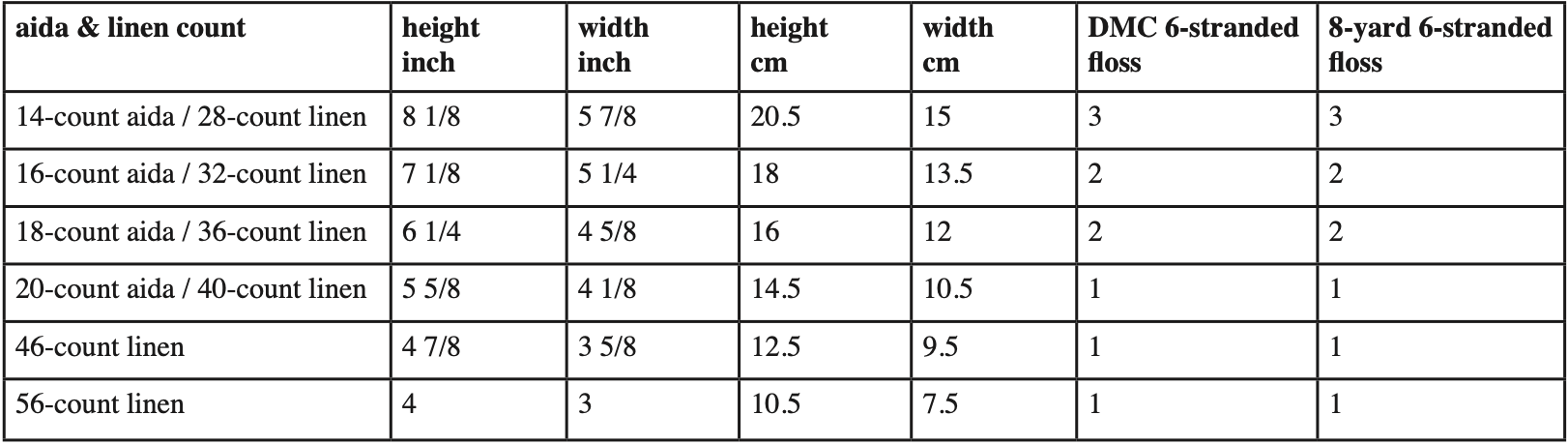 This design measures 83 crosses in width and 113 in height. It has a total of 3576 crosses. Please see the chart on the following page for size estimates. Floss estimates are based on the following calculation: 2 strands of pulled floss when working up to 18-count aida / 36-count linen, one pulled strand when working on higher counts. This pattern uses only full crosses – no specialty stitches are required.