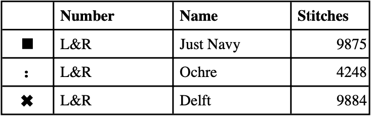 When working on 32 and 36-count linens with 2 pulled strands over 2, I would recommend getting 6 skeins of Just Navy, 6 skeins of Delft, and 3 skeins of Ochre. When working on 40 and 46-count linens with 1 pulled strand over 2, I would recommend getting 3 skeins of Just Navy, 3 skeins of Delft, and 2 skeins of Ochre.