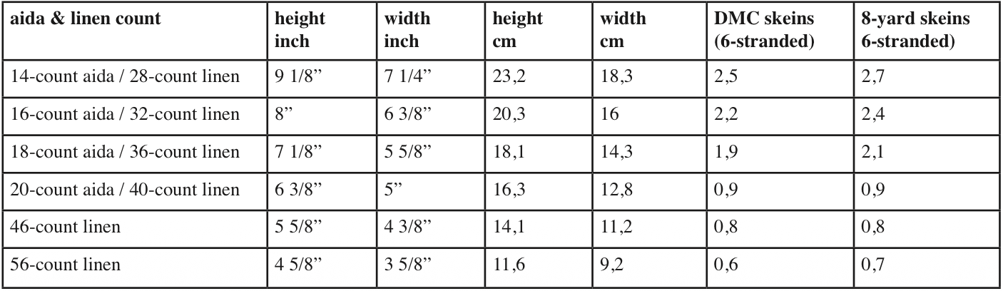 This design is 99 crosses wide and 126 crosses high and has a total of 4380 crosses. The graph below gives size estimates for a wide range of material as well as an estimation to the floss required. Please refer to the amount of floss required in the graph below. Floss calculations are based on working with two strands on 28- to 36-count linen (14- to 16-count aida). Higher counts use a single strand. You are free to stitch with as many strands as you like.