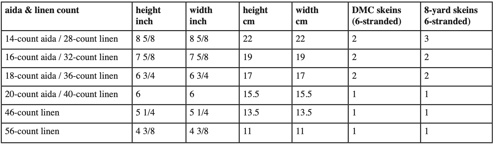 This design measures 121 crosses in width and height and has 3327 crosses. Please see the chart below for size- and floss estimates. Floss estimates are based on working with two pulled strands (14 – 18-count aida or 28 – 36-count linen) or 1 strand (20-count aida / 40-count linen and higher). It is, of course, up to you how many strands you want to use for your project. Don’t feel limited to stitching the design fully monochrome – use as many or as little colour as you wish. You can use the bonus alphabet chart to further personalise your design.