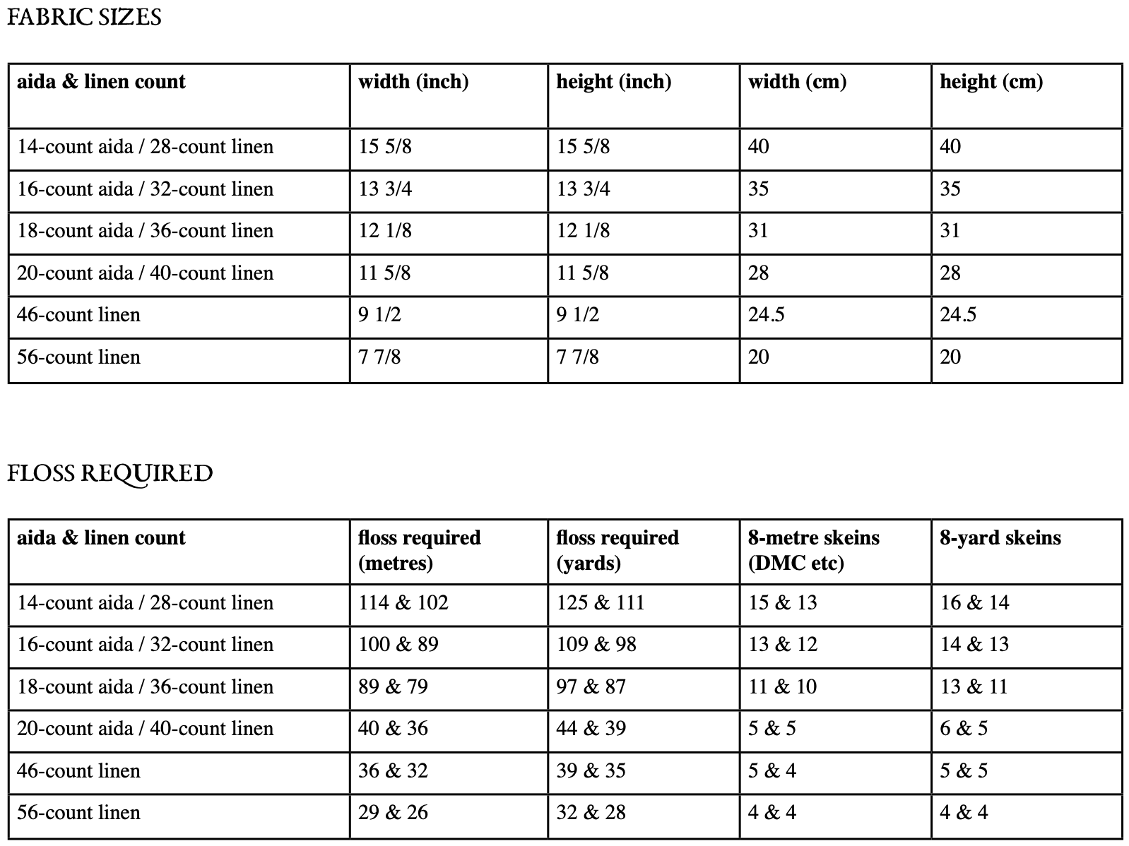 Below you will find size estimates and an estimate of the required floss. Calculations are based on working with 2 pulled strands of 6-stranded floss over 2 threads on 28, 32 and 36 count linen, and with 1 pulled thread over 2 on 40, 46, and 56 count linens.