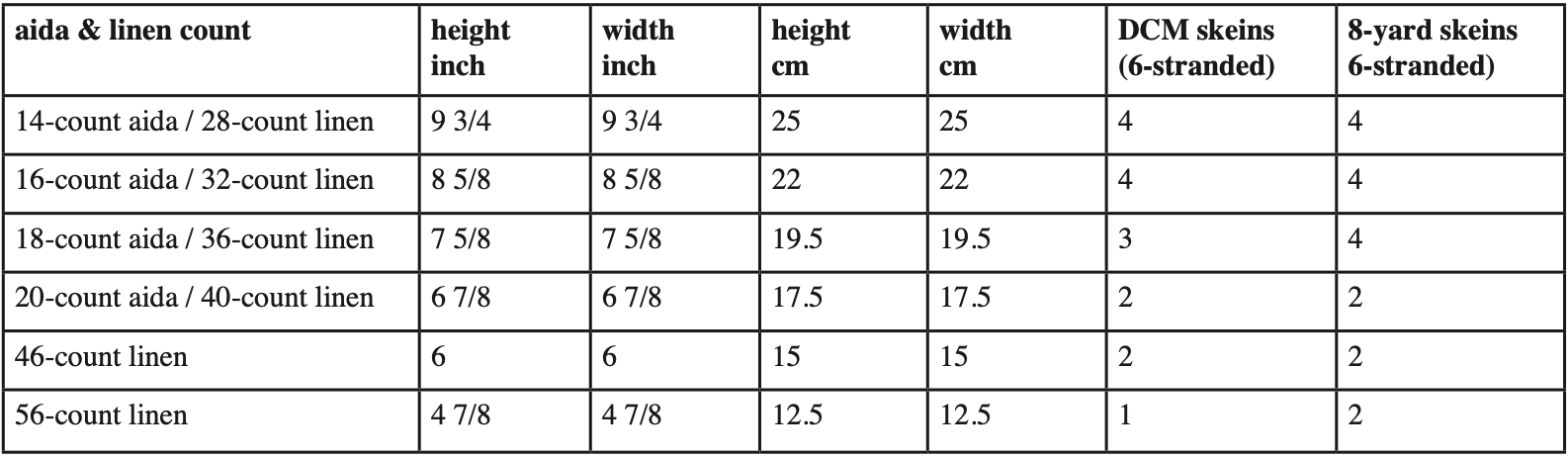 My Yuletide Cushion design measures 137 crosses in height and width,  and has a total of 6209 crosses. See the chart below for floss- and size estimates. Calculations are based on working with 2 pulled strands of floss (14-count aida up to 18-count or 28-count linen up to 36-count) or with one pulled strand for 20-count aida / 40-count linen and upwards.